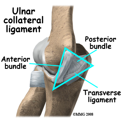 In the elbow, two of the most important ligaments are the ulnar collateral ligament (UCL) and the lateral collateral ligament. The UCL is also known as the medial collateral ligament. The ulnar collateral ligament is on the medial (the side of the elbow that's next to the body) side of the elbow and the lateral collateral is on the outside. The ulnar collateral ligament is a thick band of ligamentous tissue that forms a triangular shape along the medial elbow. It has an anterior bundle, posterior bundle, and a thinner, transverse ligament.