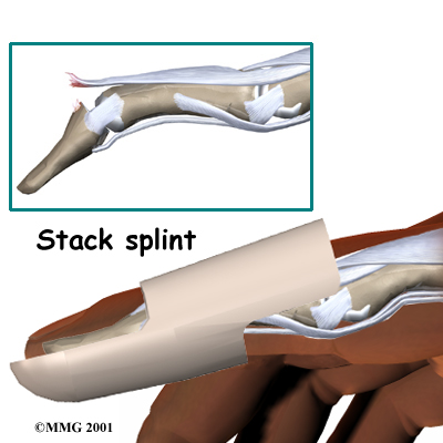 While a simple homemade splint will work, your physical therapist can provide you with a recommendation for the type that will be most beneficial to your recovery. There are many splints that have been designed to make it easier to wear at all times. In some extreme cases where the patient has to use the hands to continue working (such as a surgeon), a metal pin can be placed inside the bone across the DIP joint to act as an internal splint allowing the patient to continue to use the hand. The pin is removed at six weeks.
