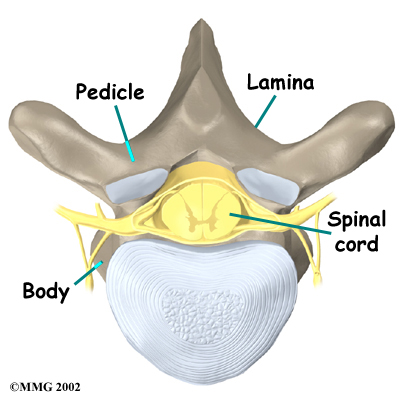 A bony ring attaches to the back of each vertebral body. This protective ring of bone surrounds the spinal cord, forming the spinal canal. Two pedicle bones connect directly to the back of the vertebral body. Two lamina bones join the pedicles to complete the ring. The lamina bones form the outer rim of the bony ring. When the vertebrae are stacked on top of each other, the bony rings form a hollow tube that surrounds the spinal cord and nerves. The laminae provide a protective roof over these nerve tissues.